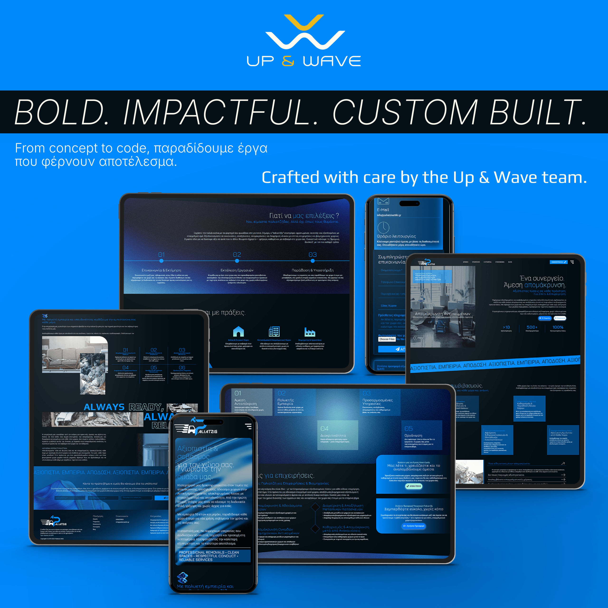Κλήση σε Δράση & Άμεση Επικοινωνία: Κάθε σελίδα τελειώνει με ένα καθαρό κάλεσμα: “Χρειάζεστε άδειασμα χώρου; Είμαστε ένα τηλεφώνημα μακριά!” μαζί με κουμπί κλήσης. Επιπλέον, υπάρχει λειτουργική φόρμα για όσους προτιμούν να στείλουν μήνυμα. Στόχος μας ήταν κανένας ενδιαφερόμενος να μην φύγει χωρίς να έχει τρόπο να επικοινωνήσει άμεσα.